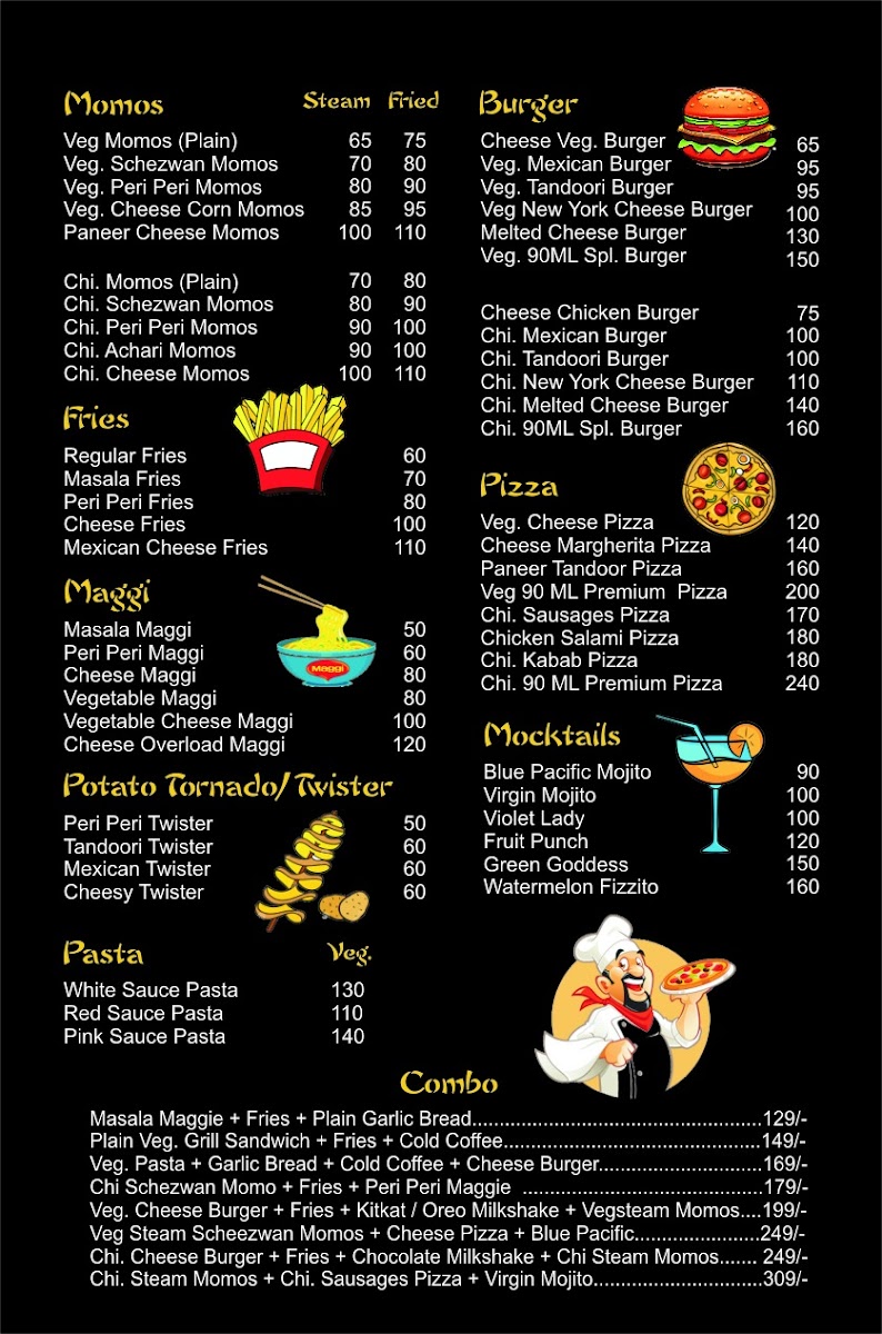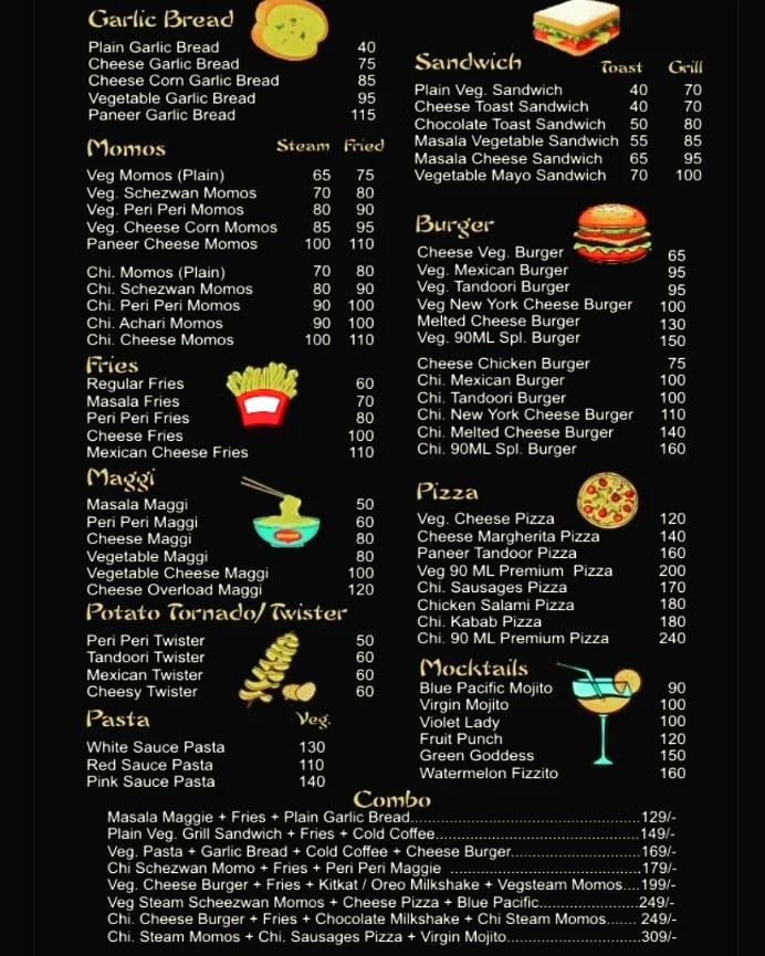 Veg Steam Scheezwan Momos + Cheese Pizza + Blue Pacific