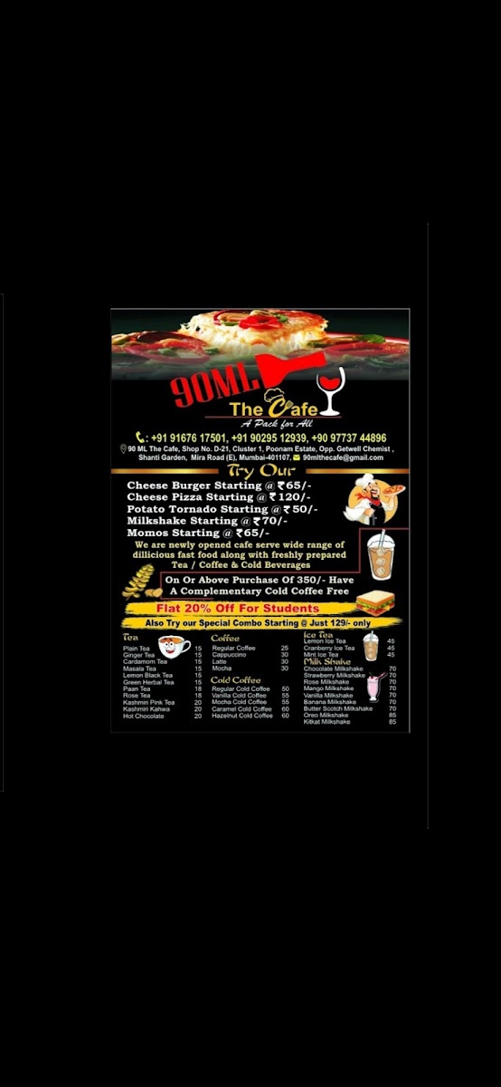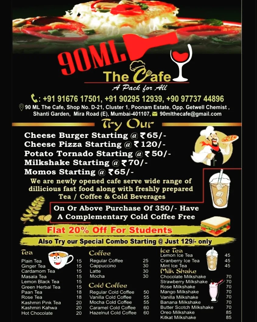 Welcome to 90MLTHE CAFE, tucked away in Mira Road East, where every bite is a celebration of flavor. This charming cafe offers a diverse menu that caters to every palate.